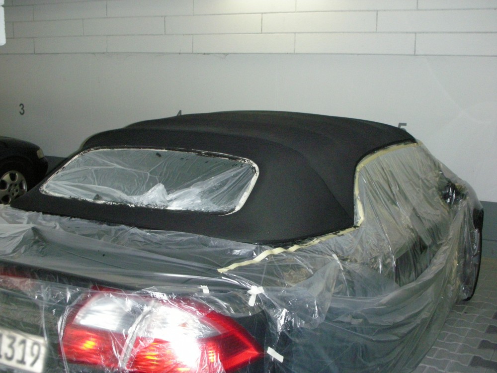 Und absolut wichtig: Das Verdeck mit Plastikfolie großräumig (minimum 1 Meter zu jeder möglichen Seite) abkleben. Beim Swizöl-Set ist sogar eine Abdeckfolie dabei. Wir hatten noch einiges vom letzten Umzug übrig, so dass dieses erstmal aufgebraucht wurde. Das Abkleben hat ca. 45 Minuten gedauert. Das lag nicht an meiner Ungeschicklichkeit, sondern eher an meiner Pingeligkeit, sollte sich aber später sehr (!) auszahlen. Mein Ziel war es, alle Gummidichtungen, Lackstellen und Glasscheiben so exakt abzukleben, dass wirklich nur noch das Stoffverddeck frei liegt und nichts auf andere Materialien kommen kann. Wichtig ist nämlich bei Renovo und bei der Swizöl-Imprägnierung, dass nichts auf andere Materialien kommt und im Fall der Fälle sofort abgewischt wird. Da sofortiges Abwischen oft nicht möglich ist oder das Zeugs unentdeckt in verdeckte Stellen läuft, wollte ich diesen Problemfall von Anfang an ausschalten. An vielen Stellen habe ich sogar doppelt abgeklebt, da gerade die runden Stellen im ersten Versuch nicht leicht mit geradem Band abzukleben sind.